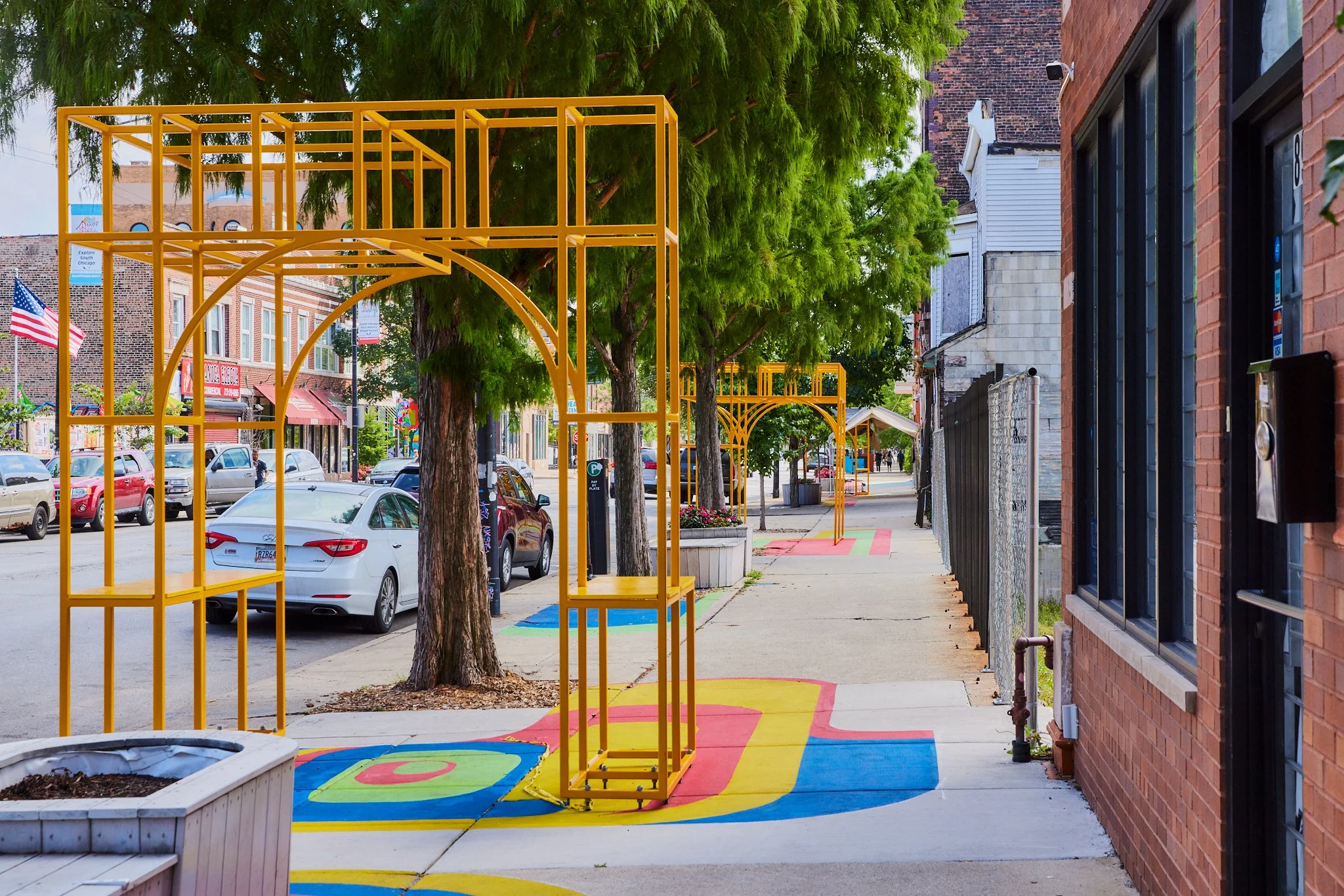 Unique furnishings installed on sidewalks encourage both movement and rest from passersby. “Art Stacks” provide additional experiential design along the corridor, and wood panels are secured by steel plates to allow additional canvases for artwork.